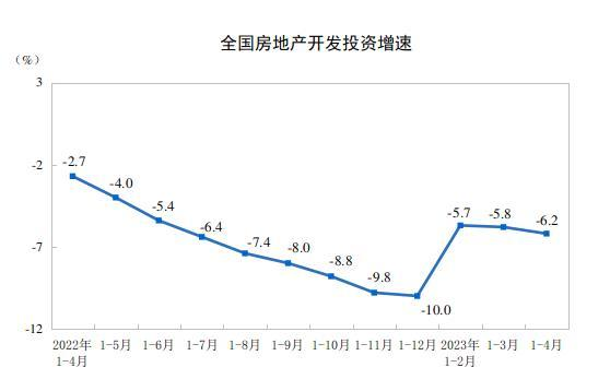 房地產開發投資完成情況,1—4月份,全國房地產開發投資35514億元,同比下降6.2%(按可比口徑計算);其中,住宅投資27072億元,下降4.9%。