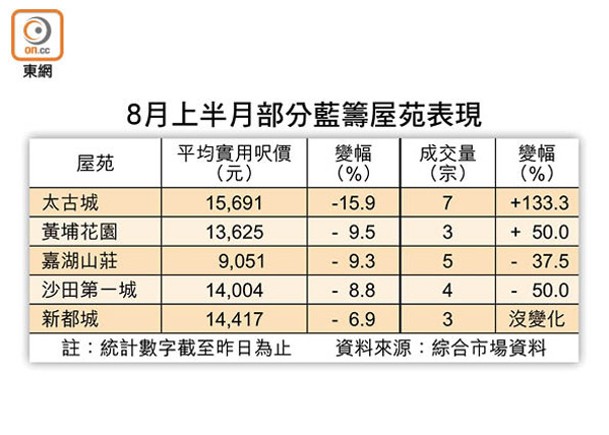 新盤低價開售,搶吸二手客源,8月上半月10大屋苑交投量低位徘徊,個別業主開始接受現實,擴大減幅出貨,期內八成項目平均實用呎價按月下跌,鰂魚涌太古城跌幅最大達15.9%。