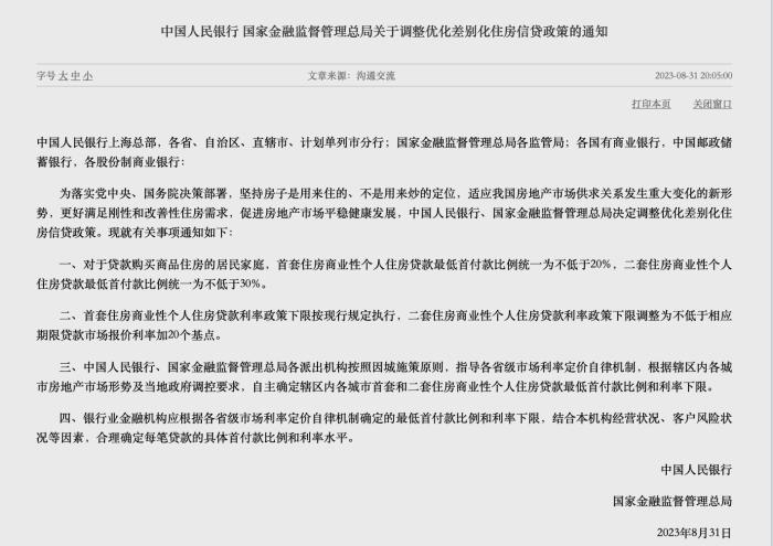 8月31日晚間,中國人民銀行、國家金融監督管理總局聯合發佈《關於調整優化差別化住房信貸政策的通知》和《關於降低存量首套住房貸款利率有關事項的通知》。
