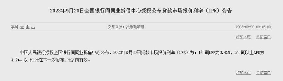 9月20日電 據央行網站消息,中國人民銀行授權全國銀行間同業拆借中心公佈,2023年9月20日貸款市場報價利率(LPR)為:1年期LPR為3.45%,5年期以上LPR為4.2%。以上LPR在下一次發佈LPR之前有效。(中新財經)