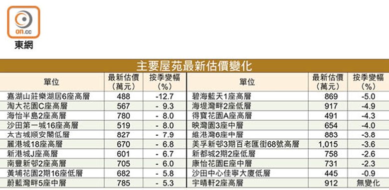 其他跌幅較大均為本港指標藍籌盤,沙田第一城16座高層單位,實用面積約327方呎,最新估價較按季挫約8%,報約519萬元。而鰂魚涌太古城及茶果嶺麗港城,期內亦錄約7.9%及6.8%跌幅。