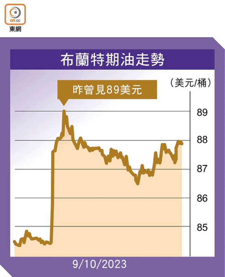 以色列強硬報復巴勒斯坦的襲擊,原本備受美國高息及經濟放緩困擾的國際油價得以「翻生」,布蘭特期油及紐約期油周一亞洲時段分別曾飆5.22%及5.36%,每桶高見89美元及87.23美元;資金同時流入美元避險,美匯指數曾漲0.5%,高見106.58。國際清算銀行(BIS)稱,現在就事件對全球經濟影響下判斷是言之尚早。