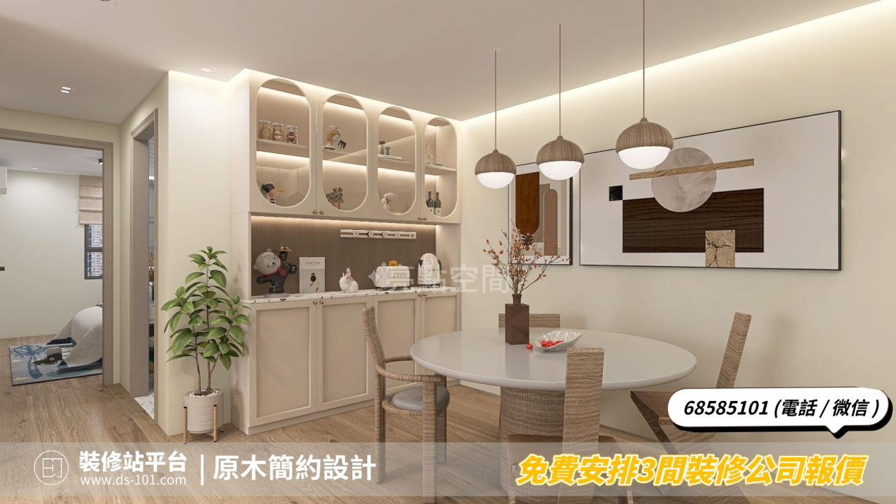 飯廳在佈置上依舊採用實木餐桌椅組合,搭配木質感的吊燈,以及奶油色的餐邊櫃,讓用餐空間顯得實用之餘,又簡約舒適~