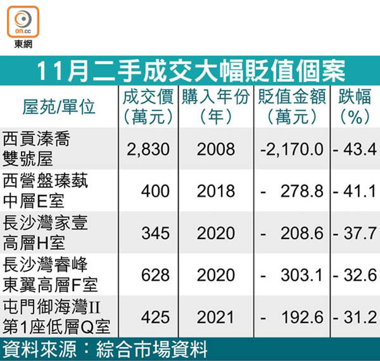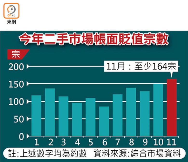 息口高企,市場普遍預計未來本港樓價跌勢持續,有更多業主選擇蝕售單位離場。綜合市場資料,全港11月湧現至少164宗住宅帳面貶值買賣,再創近年新高,已連續5個月破百宗水平,按月增約9.3%。其中,將軍澳繼續成為「重災區」,涉及跌價成交至少達30宗,而屯門、元朗及馬鞍山都錄10宗或以上損手個案。