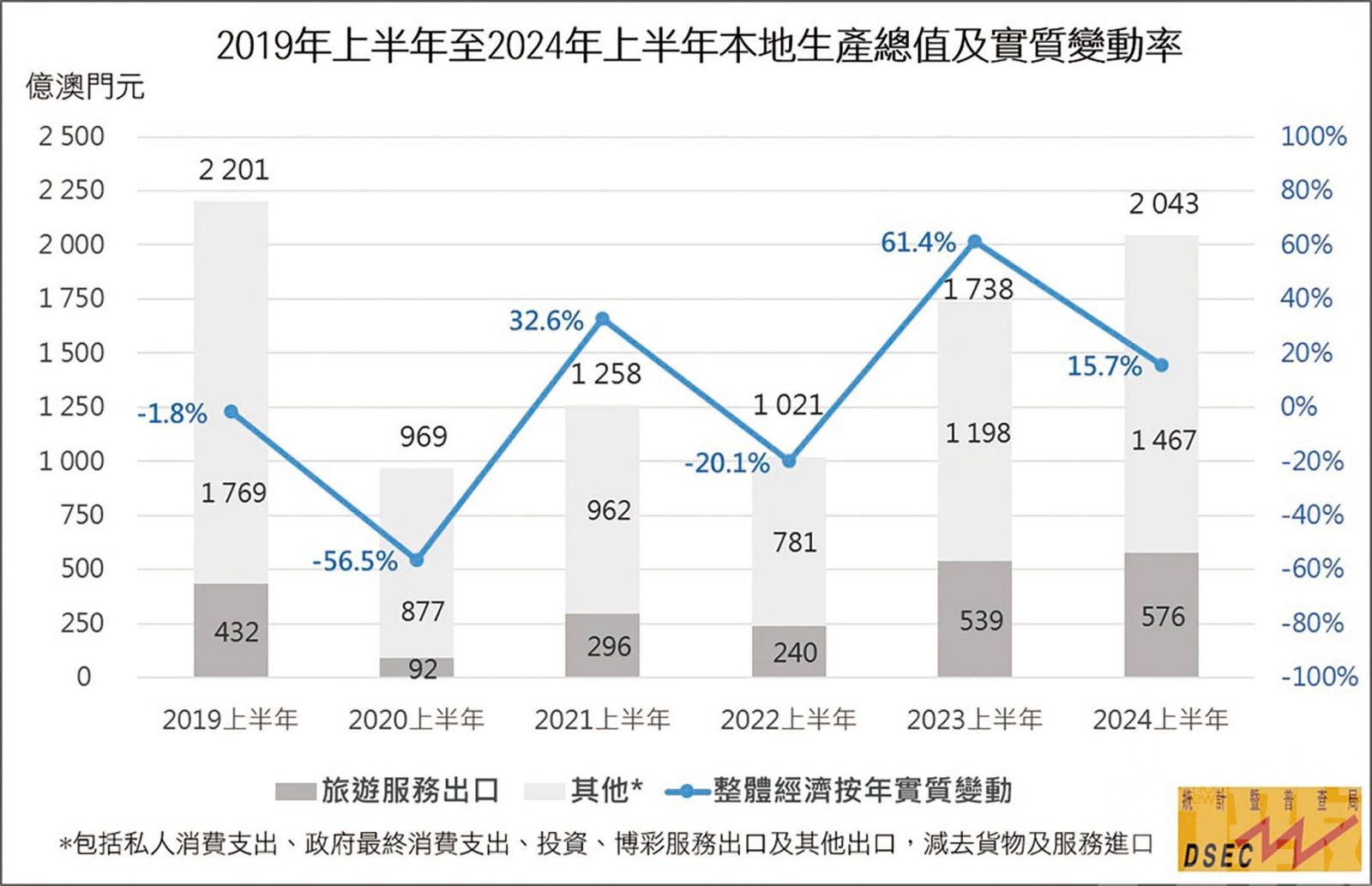 統計暨普查局資料顯示,2024年上半年本地生產總值為2,043億元(澳門元,下同),按年實質增長15.7%, 整體經濟規模回復至2019年 同 期 的86.2%, 更是自2019年後再次突破2,000億 元 水 平。 當中,服務出口按年上升17.6%,內部需求(包括私人消費支出、政府最終消費支出及投資)亦錄得2.8%的增幅。