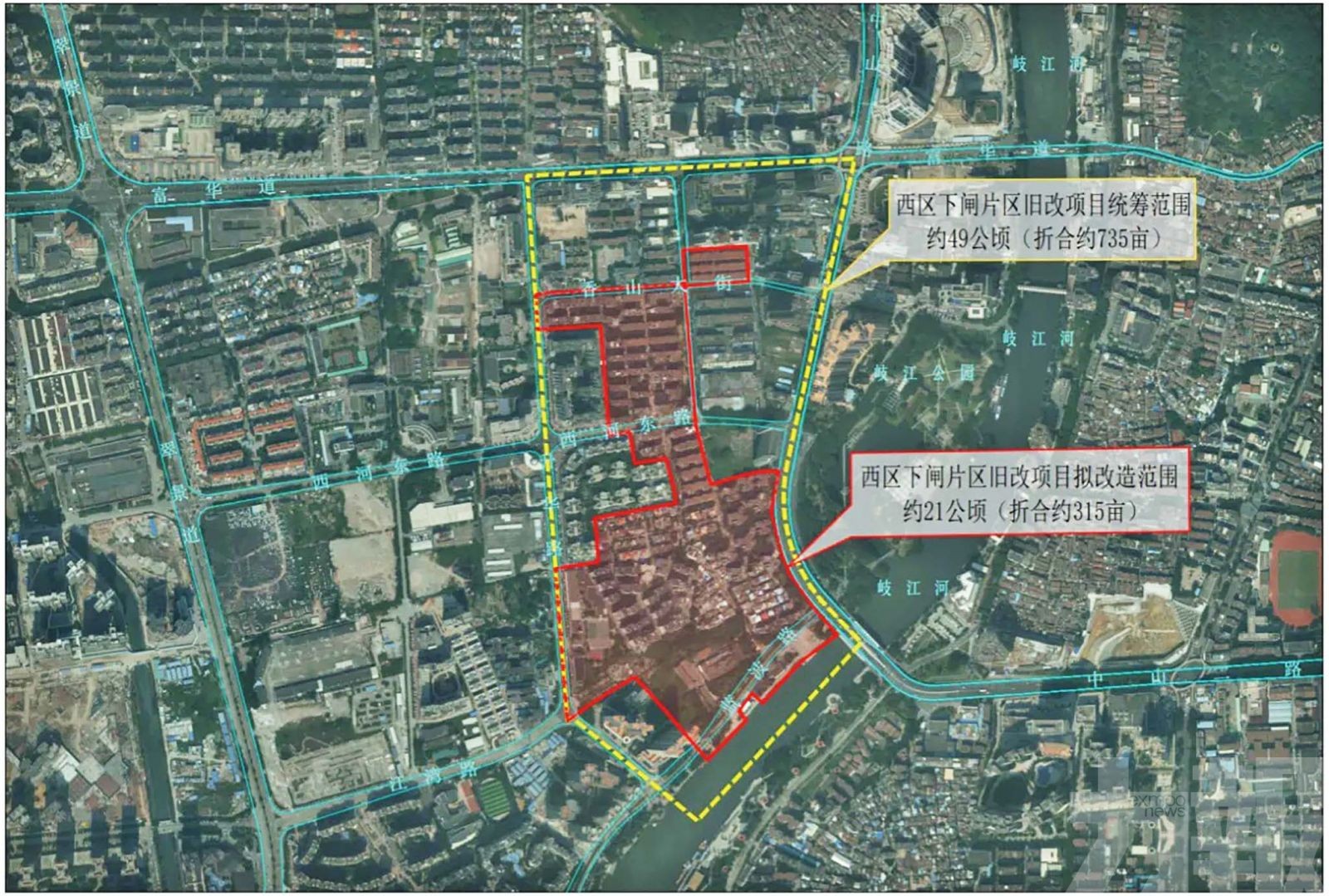 據悉,下閘舊改東至香山酒店、凱旋時代公寓、中山一路、下閘路,南至岐江河,西至昇華路、名仕經典世家小區,北至亞洲廣場、香山大街。項目體量也不小,擬改造範圍約21萬平,摺合約315畝,涉及中超花園、江畔新村、下閘新村等超社區,超2,000戶。
