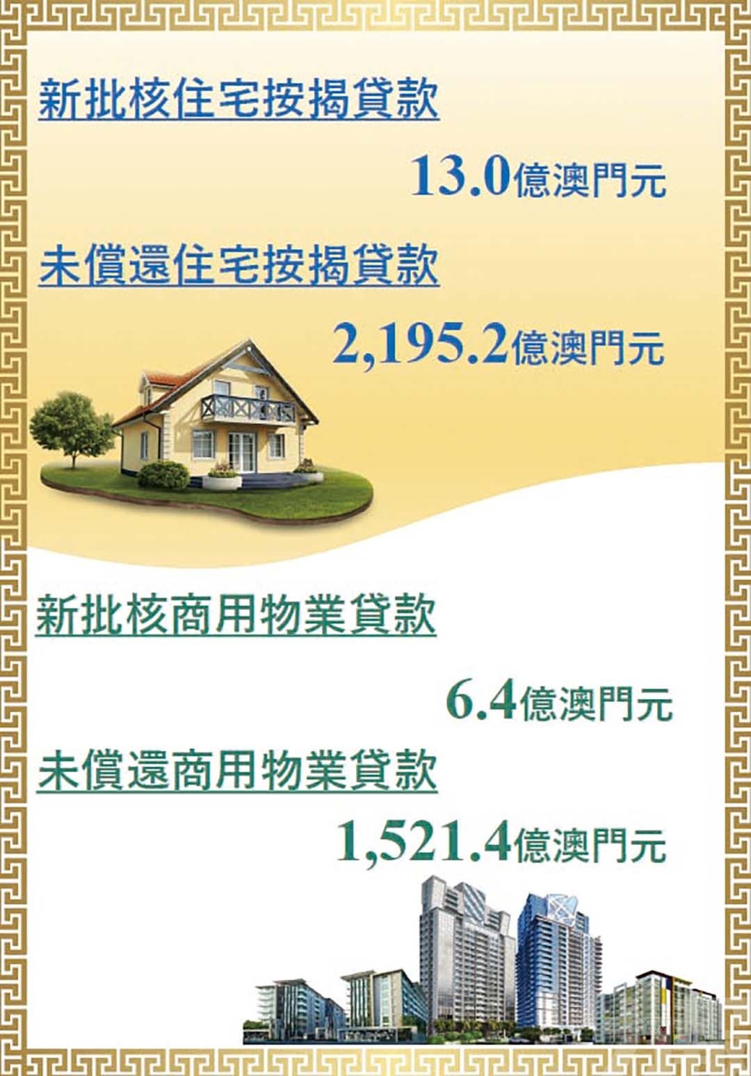 住宅按揭貸款是以澳門境內住宅物業作抵押借予個人及公司的信貸安排,包括用於購買住宅物業及其他用途(如:轉按/加按、營運資金及貿易融資等)。商用物業貸款是以澳門境內商用物業作抵押借予個人及公司的信貸安排,包括借予建築公司、用於物業發展及投資的貸款。