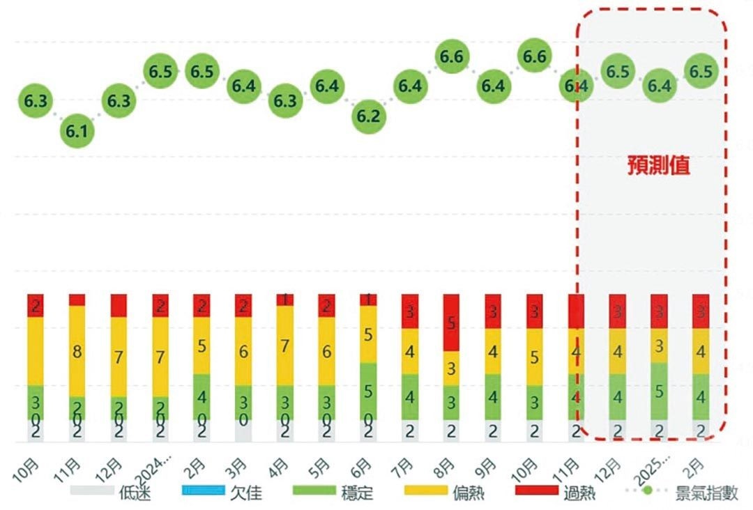 澳門經濟學會發佈最新澳門經濟景氣指數走勢,當中指出,今年10月與11月期間,本澳經濟景氣指數體系中的十三項指標依然呈現「兩極化」分佈。其中,10月本澳貨幣供應M2同比增長7.5%至7,828億澳門元的歷史新高,顯示金融體系流動性充裕。與此同時,在旅遊相關行業的強勁復甦帶動下,就業市場偏熱,總就業人數持續增加,且失業率也持續多月維持在1.7%的低位。總體而言,M2、訪澳旅客數目、就業人數等七項指標處於「偏熱」或「過熱」狀態;受旅客結構及消費模式的轉變化及本地消費外流的影響,本地零售及飲食消費的需求勉強保持在「穩定」等級;內地消費者信心指數和六大綜合旅遊休閒企業的股價仍「低迷」。經綜合分析及推算,10月、11月份的澳門經濟景氣指數分別為6.6 和 6.4 分;今年12月至明年2月期間將維持在6.4-6.5分左右,屬「穩定」等級。