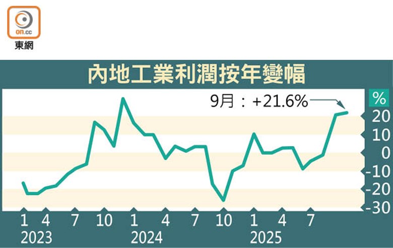內地政府牽頭的「反內捲」行動,再次帶動工業企業利潤急升,9月份規模以上工業企業利潤按年升幅擴至21.6%,創近兩年單月最大漲幅。惟外界料10月升勢將減弱,因去年同期基數效應或將褪色。為推動明年起錨的「十五五」(第15個5年)規劃期間經濟增長,中國社科院學部委員、人行貨幣政策委員會前委員余永定昨高調提倡,應讓投資在推動經濟中發揮更大作用,甚至參考2008年「四萬億(人民幣•下同)刺激」計劃。