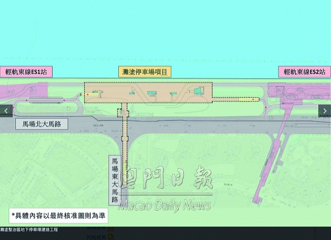 至於位於鄰近馬場北大馬路及友誼橋大馬路沿海堤一側的灘塗整治區內的地下停車場,介乎於輕軌東線ES1站與ES2站之間,預計可提供逾一百八十個汽車泊位及逾九十個電單車泊位。停車場的入口車道靠ES2站一側,出口車道靠ES1站一側,車輛南入北出流動,能避免停車場入口車流影響馬場北大馬路往東方明珠方向的交通。項目亦將建造連接馬場東大馬路往停車場的出入口車道,以便黑沙環區的居民使用停車場及乘搭輕軌。判給方面,將由中鐵第四勘察設計院集團有限公司澳門分公司設計,特納唐遜(澳門)有限公司負責工料測量,奧雅納工程顧問提供項目管理服務,澳大工程研究及檢測中心有限公司、澳門發展及質量研究所分別提供土木工程範疇及機電工程範疇的圖則檢查服務。