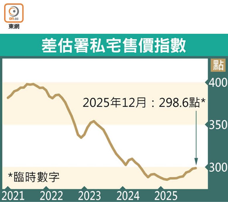 差餉物業估價署昨日公布的臨時數據顯示,去年12月私人住宅售價指數報298.6點,按月再升約0.23%,連升7個月為逾4年半最長升浪,累漲約4.22%。該指數去年全年反彈向上,惟對比2021年9月的歷史高位398.1點,仍低出約24.99%。