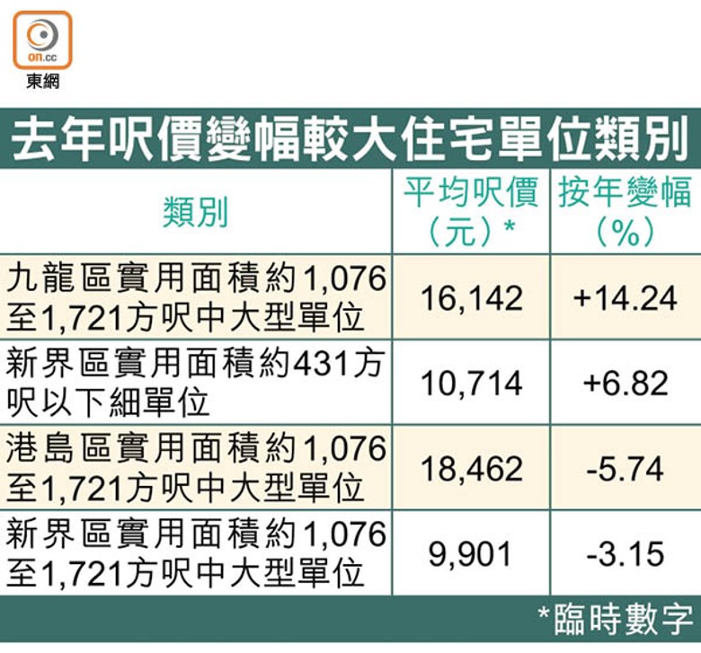 以全年計,以九龍區實用面積約1,076至1,721方呎的中大型單位漲幅較大,該類別單位去年12月平均呎價報約16,142元,按年顯著回升約14.24%;按月則下跌約2.14%。