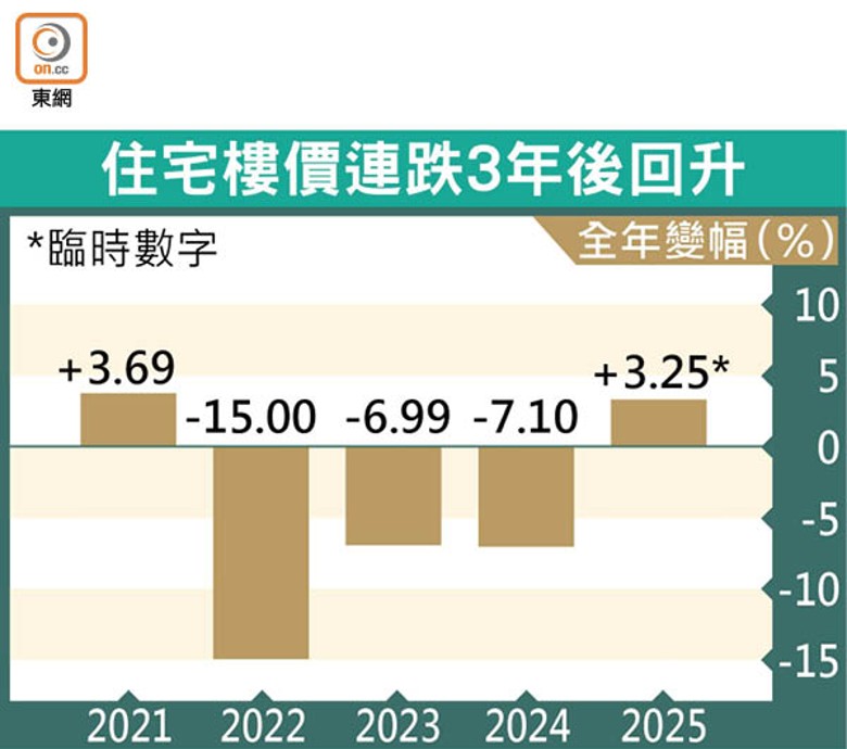 資料顯示,樓價指數自2022年開始下挫,當年跌幅高達15%,其後2023年及2024年分別下跌約6.99%與7.1%,3年累挫約26.6%;雖然去年樓價回升,但較2021年仍低逾24%。