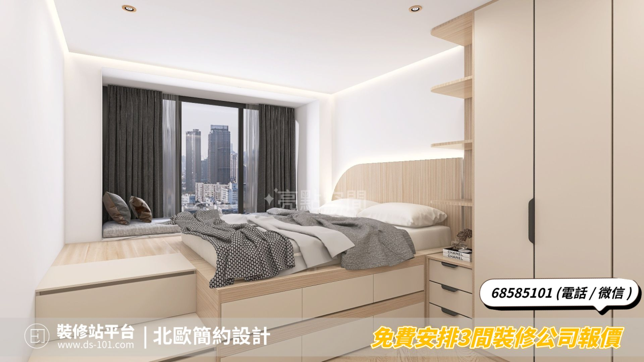 主臥採用業主喜歡的地台床設計,增加小空間的收納空間,同時,搭配深色窗簾和木質臥室家具,營造出一種踏實,溫柔的臥室氛圍。