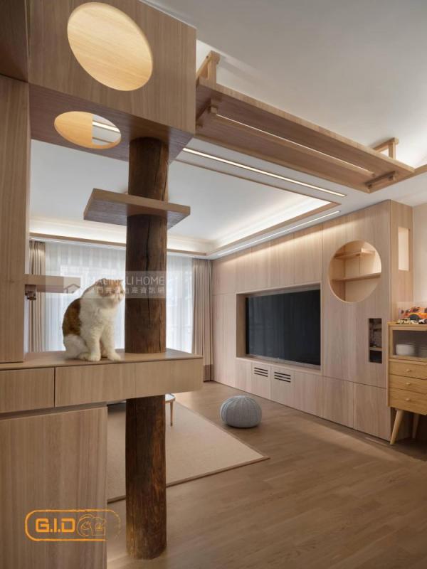 通過這些元素,我們把空間從三維角度來分析,設計出兩條動線。天花牆面就作為貓的活動區域,貓可以漫步遊走,飛簷走壁,跳牆越城。人的活動行走範圍界定在地面。貓的行走動線和空間的功能設計進行結合,玄關櫃既是收納功能,又是貓爬架的跳板;天花吊頂既是空間的設計展示,又是貓的行經路線;電視櫃既是功能的考慮(可自行組裝內部所需空間),又是貓休憩的場所。我們通過貓的行動路線作為一條線,貫穿所有的功能空間。