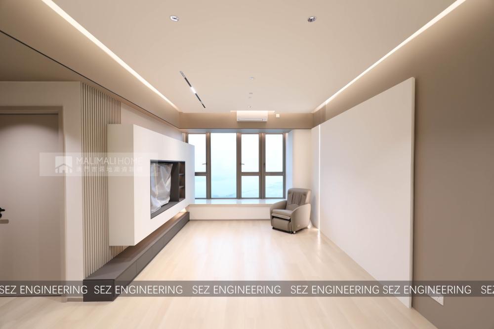 客廳與飯廳以電視牆為主體連接, 以淺灰色面搭配白色展示櫃, 做了整面牆的收納, 並增加收納空間, 開放式與封閉式結合, 既滿足不同的收納需求, 給予住家一種整潔簡約的空間感. 開放格中可以根據自己的喜好去裝飾, 隨意變換, 保持家中的新鮮感.
